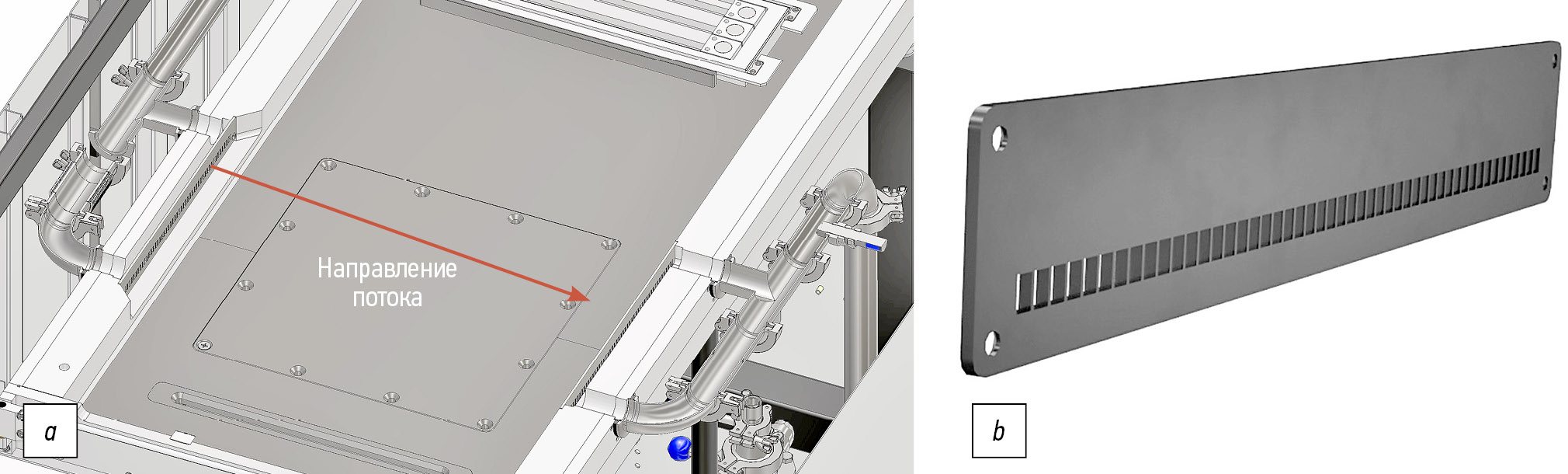Рис. 4. Общий вид платформы и циркуляция газа (а), деталь (b).