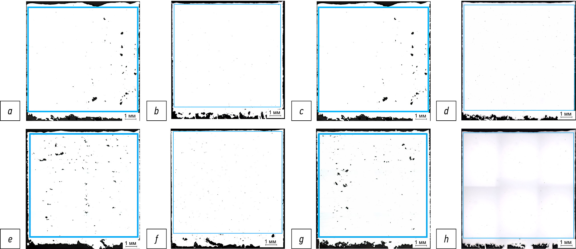 Рис. 6. Определение пористости деталей, лазер № 1: без ламинаризатора (a), с использованием ламинаризатора (b); лазер № 2: без ламинаризатора (c), с использованием ламинаризатора (d); лазер № 3: без ламинаризатора (e), с использованием ламинаризатора (f); лазер № 4: без ламинаризатора (g), с использованием ламинаризатора (h).