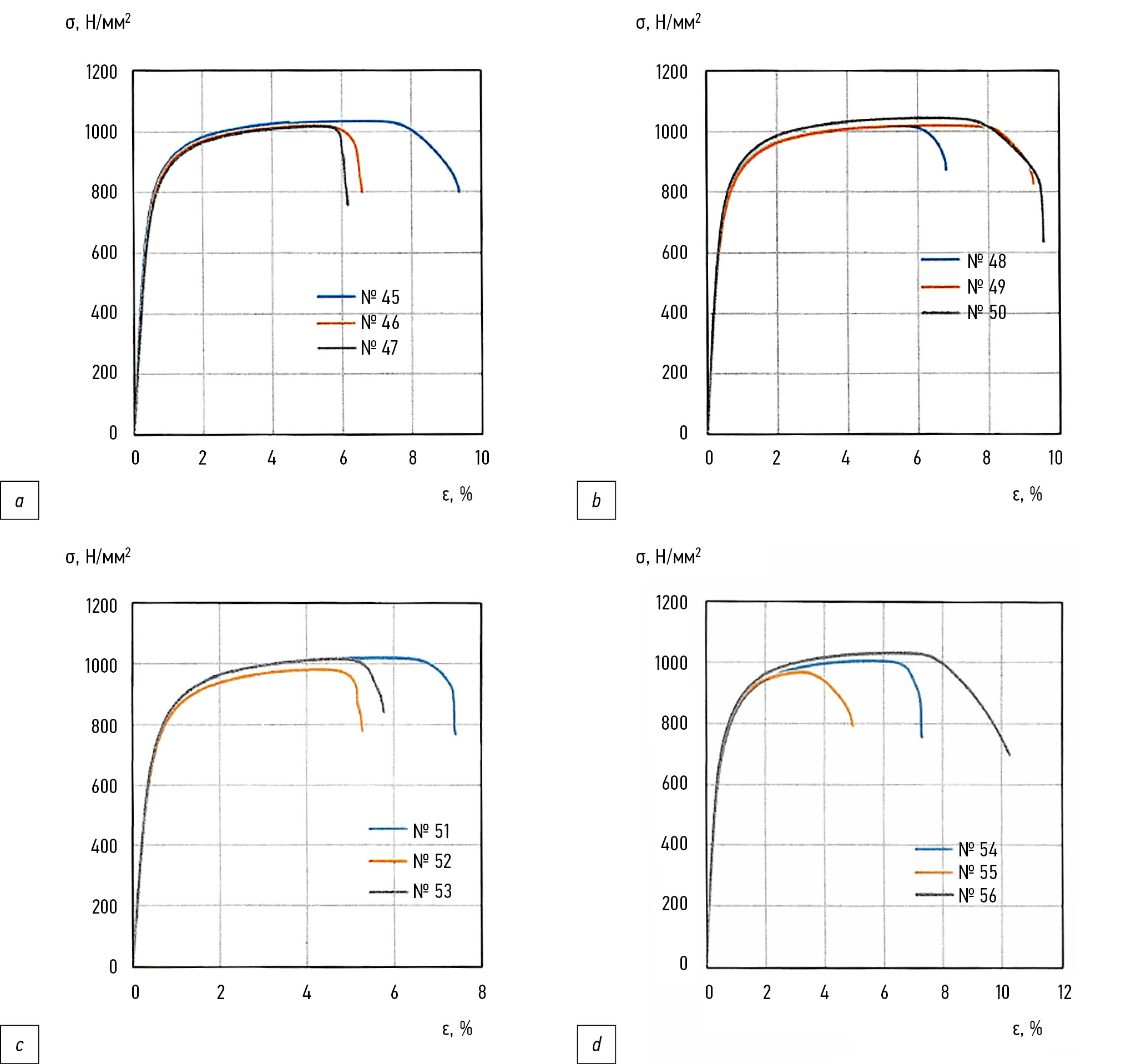 Рис. 7. Диаграммы деформирования при растяжении: лазер № 1 (a); лазер № 2 (b); лазер № 3 (c); лазер № 4 (d).