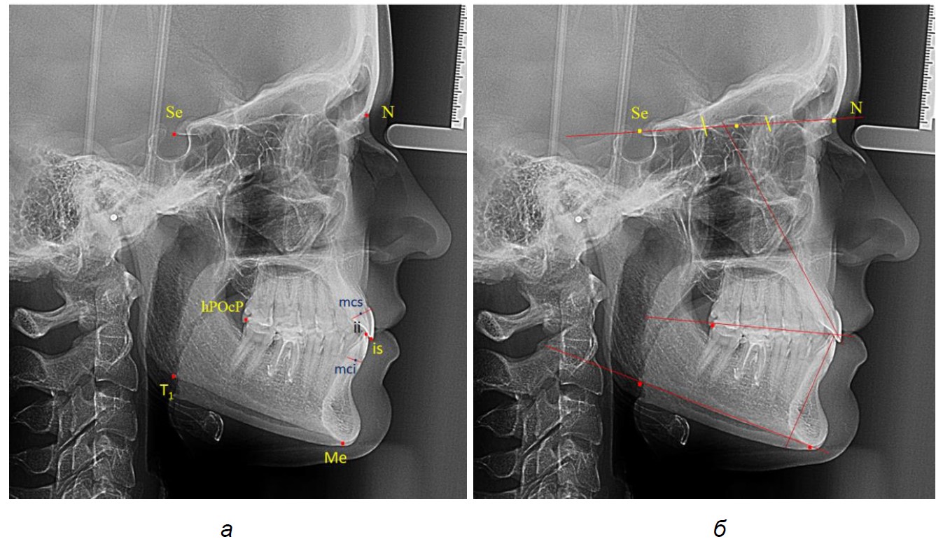 Исследование проводилось в два этапа. На первом этапе анализировали все рентегнограммы. При этом использовали общепринятые ориентиры, в частности: точки: Se; N; Me; T1; дистальную окклюзионную точку hPOcP (контактная точка окклюзии дистальной поверхности второго нижнего моляра), перхнерезцовую точку is (incisive superior – режущий край верхнего резца); нижнерезцовую точку ii (incisive inferior – режущий край нижнего резца).