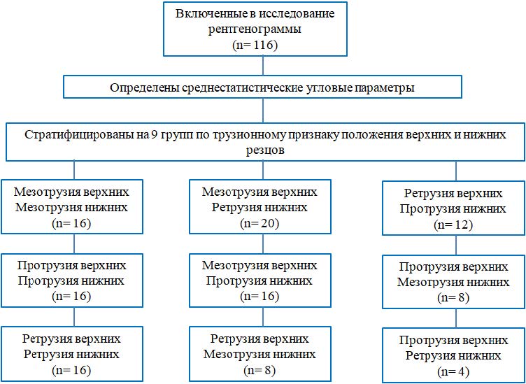 Исследование носило ретроспективный кагортный характер и включало анализ 116 архивных телерентгенограмм пациентов с физиологическими вариантами окклюзии.