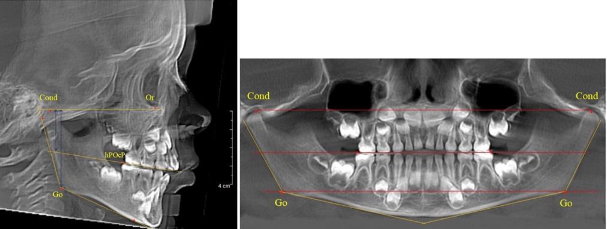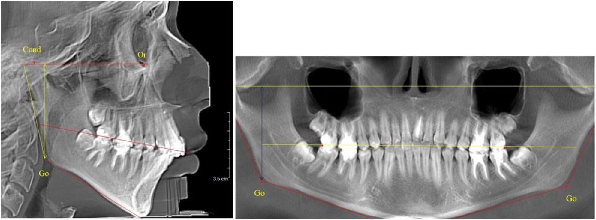 На ортопантомограмме точки Cond соединяли между собой суставной линией Cond-Cond. Касательная к ветви нижней челюсти соединяла выступающие точки, которые соединялись в области угла и определяли положение точки гонион Go с обеих сторон, которые соединяли гониональной линией Go-Go.