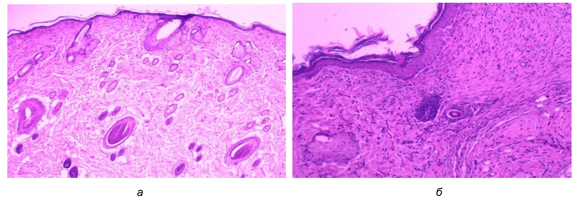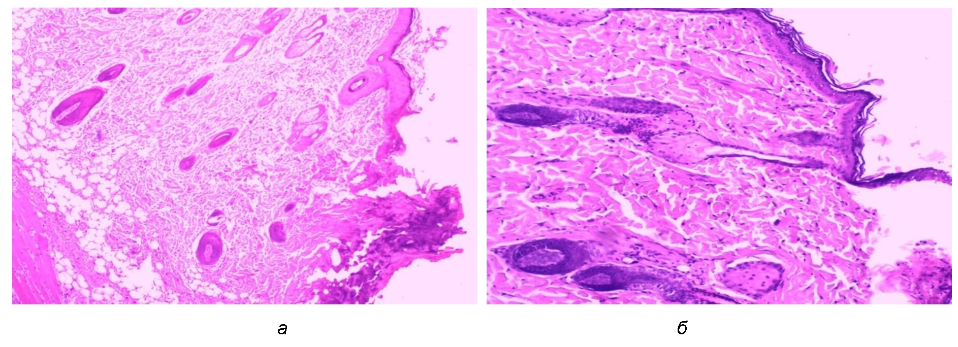 Для морфологических исследований образцы тканей (фрагменты кожи и подлежащих тканей) фиксировали в 10%-м растворе нейтрального забуференного формалина (рН-7,4) в течение 24 часов с дальнейшим обезвоживанием в батарее спиртов и изготовлением парафиновых блоков. На роторном микротоме изготавливали срезы толщиной 5–6 мкм. Для выявления патологических процессов производили окрашивание гематоксилином и эозином по общепринятой гистологической методике.