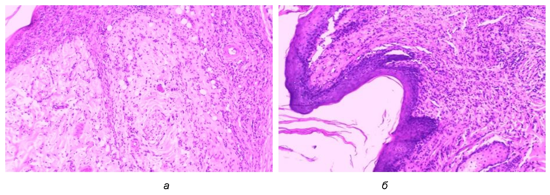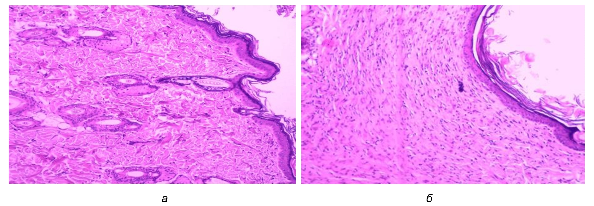 Рис. 4. Структурные изменения в области раневого дефекта: а – I группа: моделированная рана крысы в возрасте 24 мес. на 28-е сутки опыта; б – II группа: моделированная рана крысы в возрасте 24 мес. с СД2Т на 28-е сутки эксперимента. Окраска гематоксилином и эозином. Ув. ×100