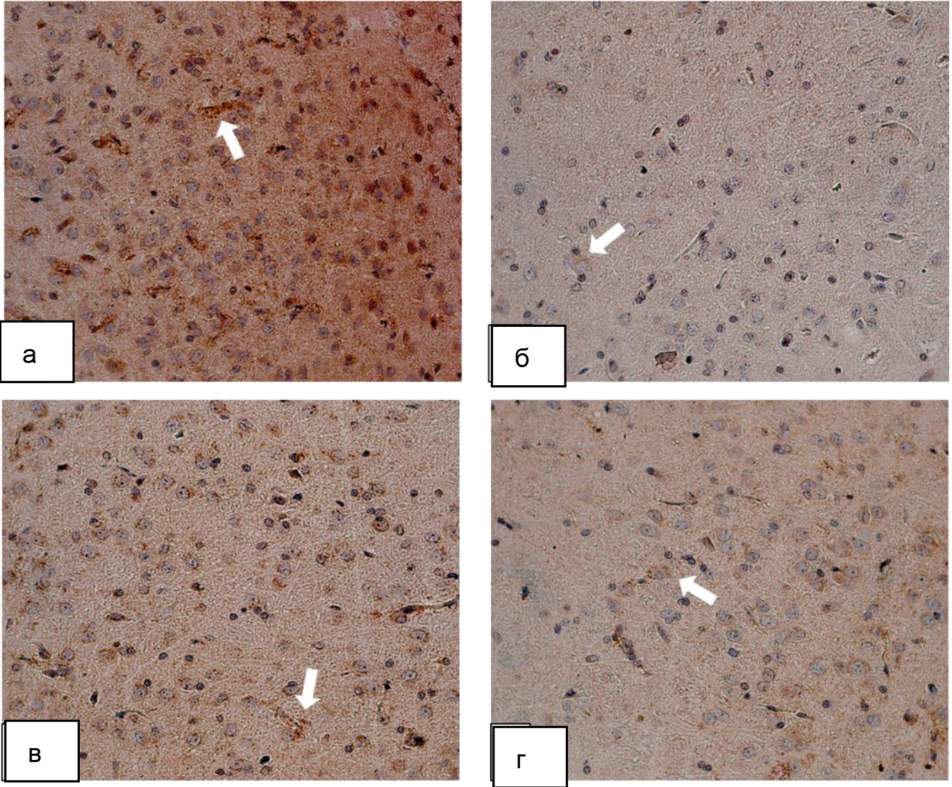 Рис. 1. Изменение экспрессии белка Klotho в цитоплазме нейронов гипокампа крыс при экспериментальном сахарном диабете: а – группа интактных животных (крысы без СД); б – группа животных с сахарным диабетом (СД); в – группа животных с сахарным диабетом и фармакокоррекцией аминалоном (СД + аминалон); г – группа животных с сахарным диабетом и фармакокоррекцией сукцикардом (СД + сукцикард). Иммуногистохимическое исследование, антитела против белка Klotho, докраска гематоксилином. Увеличение ×400. Белые стрелки – экспрессия ИРМ