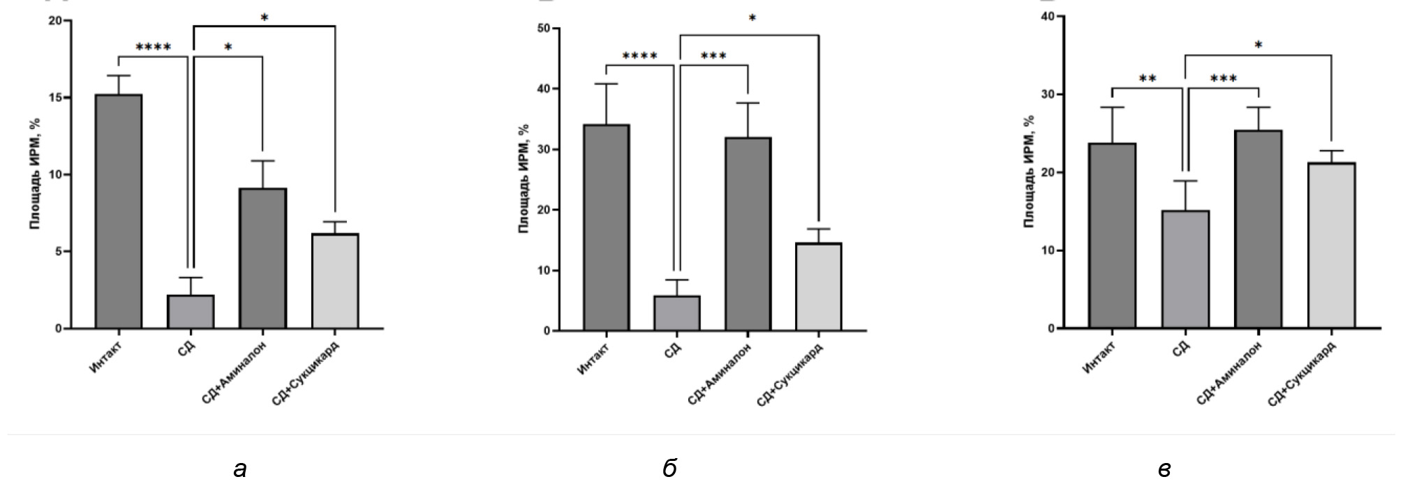 У животных, получавших сукцикард, иммуногистохимическая реакция в гипокампе [(6,19 ± 0,34) %], гипоталамусе [(14,61 ± 0,75) %] и таламусе [(21,28 ± 0,54) %] была менее выраженной, чем в группе аминалона, однако превышала показатели нелеченого контроля [на 3,98 % (p < 0,05), 8,73 % (p < 0,05) и 6,12 % (p < 0,05) соответственно], что может свидетельствовать о частичной компенсаторной активности.