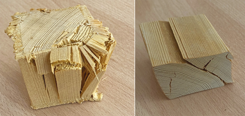 В ходе проведения опытов был выполнен сравнительный анализ для образца из термированной лиственницы и обычной лиственницы. Для испытания термированной лиственницы потребовалось предварительно подготовить образцы, которые термировались при температуре 165 °С в течение 2,5 недель. Далее было проведено испытание образцов на сжатие с помощью гидравлического пресса (рис. 1). Максимальная нагрузка, которую выдержал образец из лиственницы, волокна которой расположены вдоль, — 5 тонн, термолиственница выдержала 10 тонн. Максимальная нагрузка, которую выдержала лиственница, волокна которой расположены поперек, — 515 кг, термолиственница выдержала 700 кг. На рис. 2 представлены образцы после испытания.