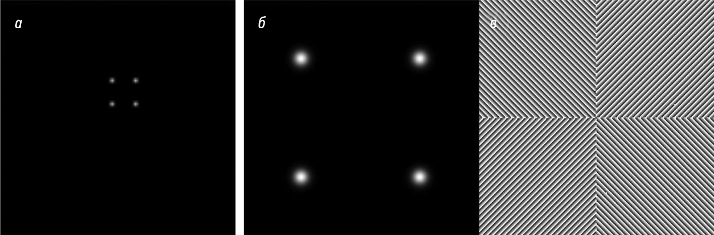 2. Рис. 1. а — изображение, загруженное в программу; б — полученное распределение интенсивности; в — полученное фазовое распределение