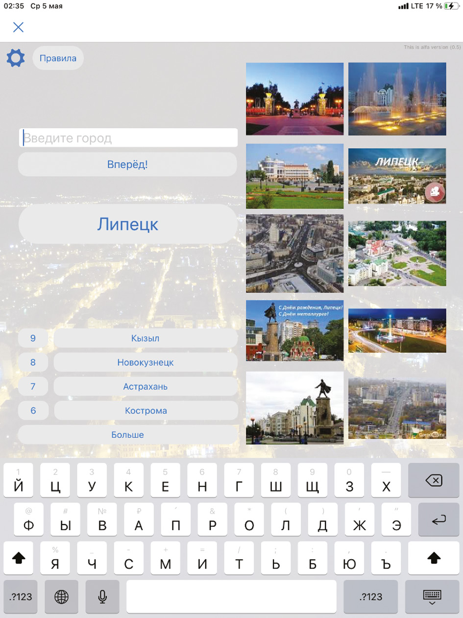 Background. In today’s world, the relevance of mobile platforms is growing, so it seems appropriate to develop an application for iPad rather than for PC. A survey among potential users showed interest in playing “Cities” illustrated with randomly chosen images from the Internet. Analysis of applications in the AppStore showed that there are two analogues — applications for playing “Cities”, but they don’t include illustrations of cities in them. A detailed analysis resulted in a list of shortcomings in existing applications for playing cities, which make their use less practical and less fun.