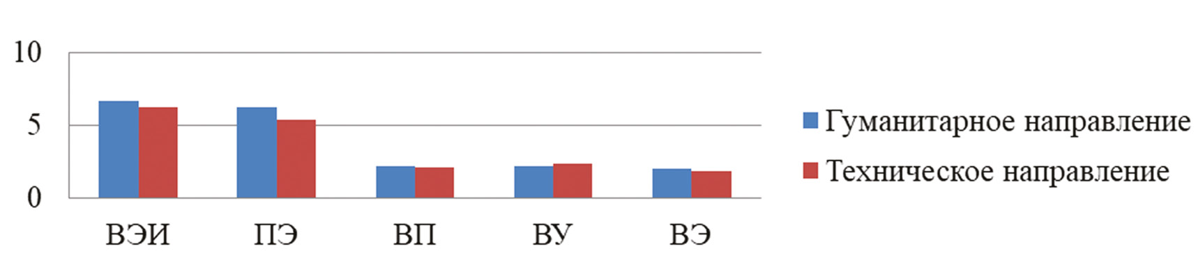 Результаты. Показатели ВЭИ (внутриличностный ЭИ) на 15,6 %, МП (понимание чужих эмоций) на 10 %, ВП (понимание своих эмоций) на 10,24 % и ВЭ (контроль экспрессии) на 27,3 % выше у женщин гуманитарного направления, по сравнению с женщинами технического направления подготовки (рис. 1). Это может быть обусловлено тем, что гуманитарные науки развивают навыки критического мышления и саморефлексии, а также включают творческие элементы, что в совокупности дает больше возможностей для практики вербального описания своих эмоций и способствует развитию более высокой эмпатии.