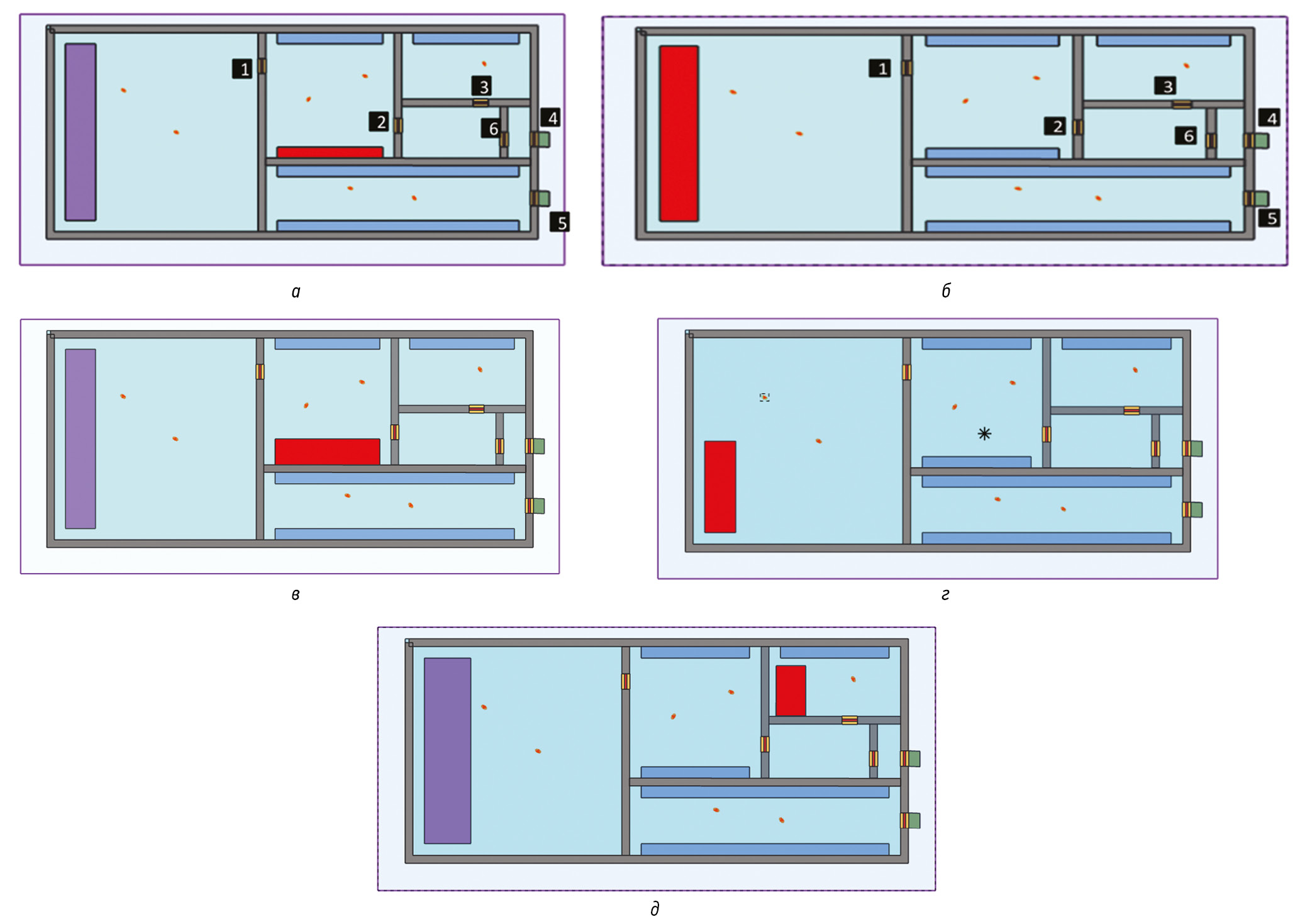 Рис. 1. Схема производственного объекта и сценарии пожара: а — сценарий 1; б — сценарий 2; в — сценарий 3; г — сценарий 4; д — сценарий 5; 1–6 — нумерация дверей помещений
