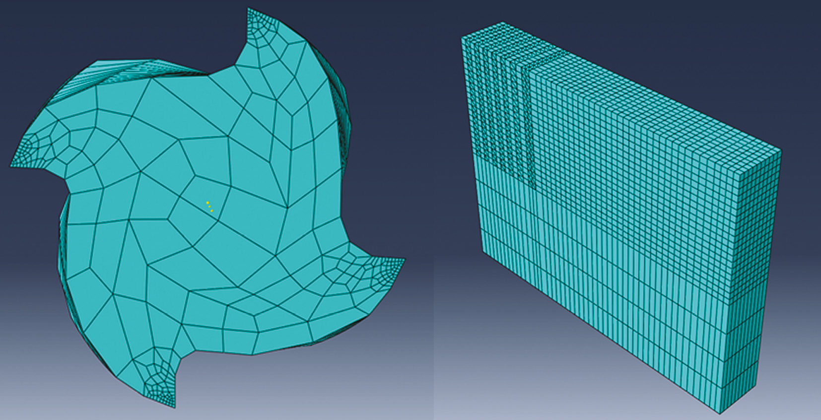 Подготовка модели. Создан прямоугольный блок — геометрическая модель заготовки для фрезерования. В зоне резания выполнено адаптивное сгущение сетки с учетом геометрии фрезы и распределения силовых нагрузок в процессе обработки. В результате получено повышение точности моделирования. Включена функция теплосиловой связанный анализ (Coupled Temp-Displacement) и задана теплопроводность, удельная теплоемкость и коэффициент теплового расширения материала.