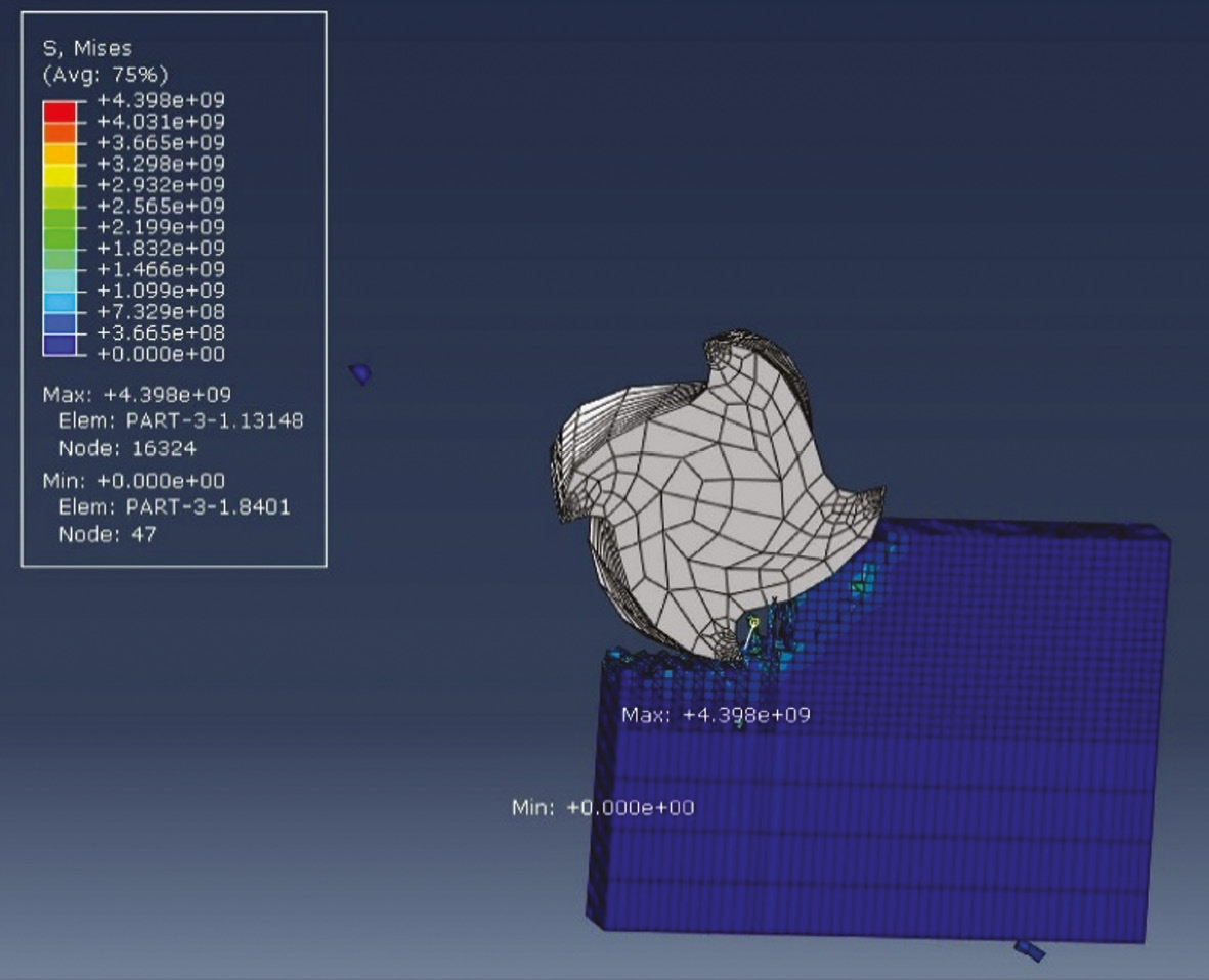Методы. Для разработки конечно-элементной модели применена программа Abaqus CAE. Для описания процесса фрезерования используется уравнение Джонсона–Кука. Оно позволяет описывать сложное поведение материалов при экстремальных условиях. Уравнение включает три основных компонента: деформационное упрочнение, описывающее рост напряжений при увеличении пластической деформации; зависимость прочности от скорости деформации, отражающая реакцию материала на высокие скорости нагружения; термическое разупрочнение, характеризующее снижение прочности при нагреве. Эти эффекты в совокупности возникают при резании: материал подвергается быстрым деформациям, нагреву из-за трения и пластической деформации, а также наклепу [4].