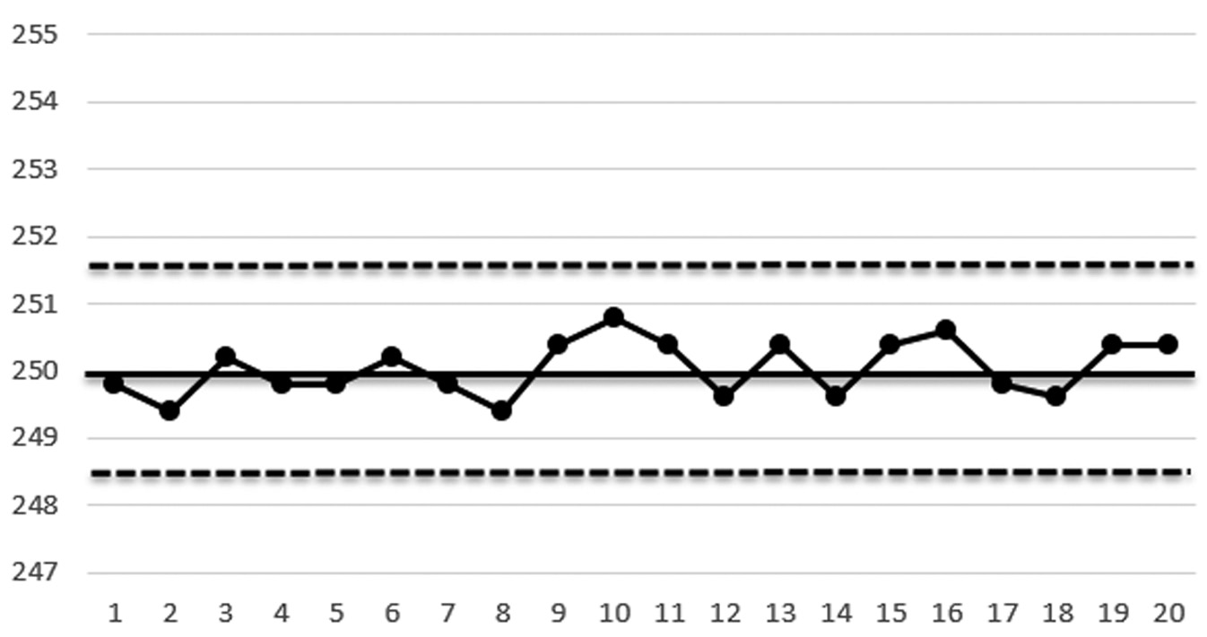 На рис. 3 представлена контрольная карта средних арифметических значений, демонстрирующая процесс, находящийся в статистически управляемом состоянии.