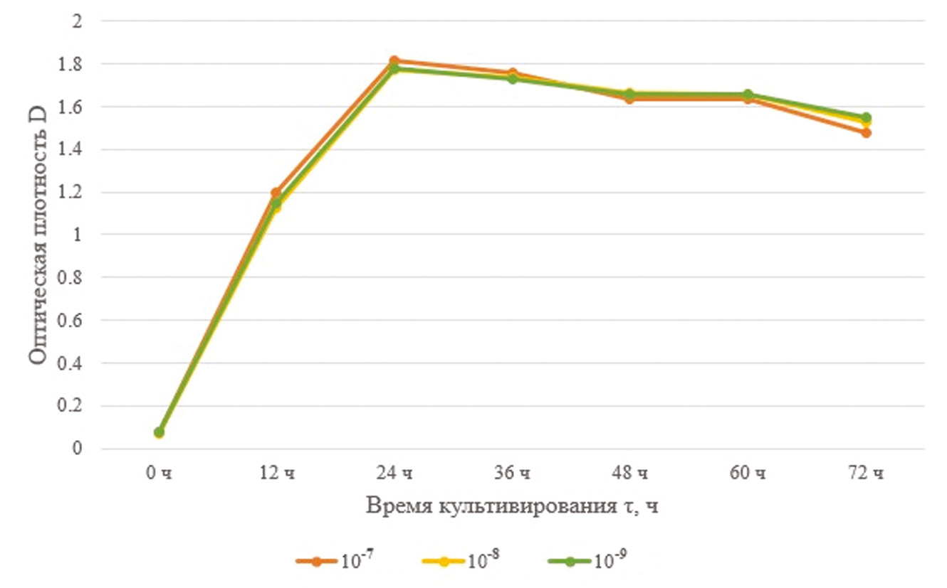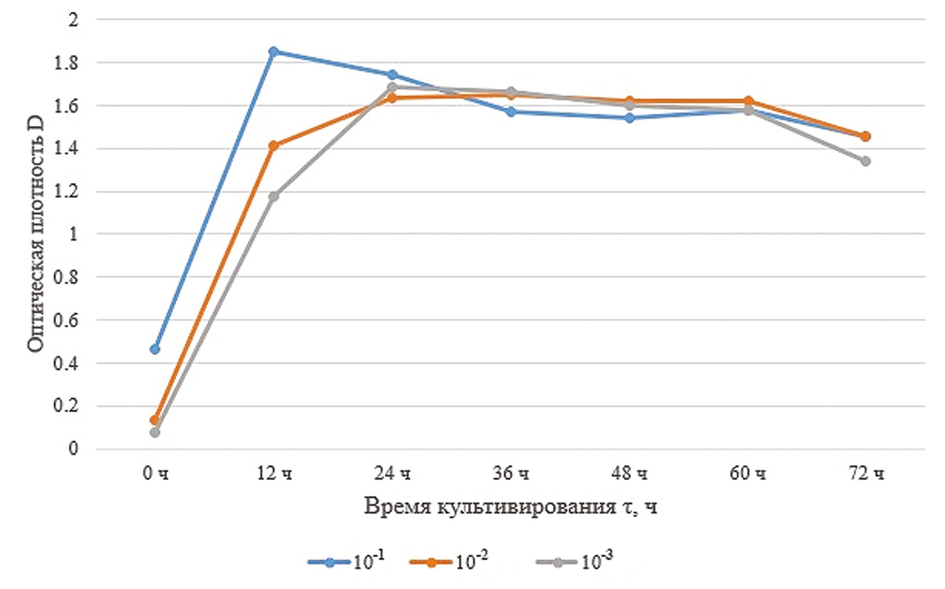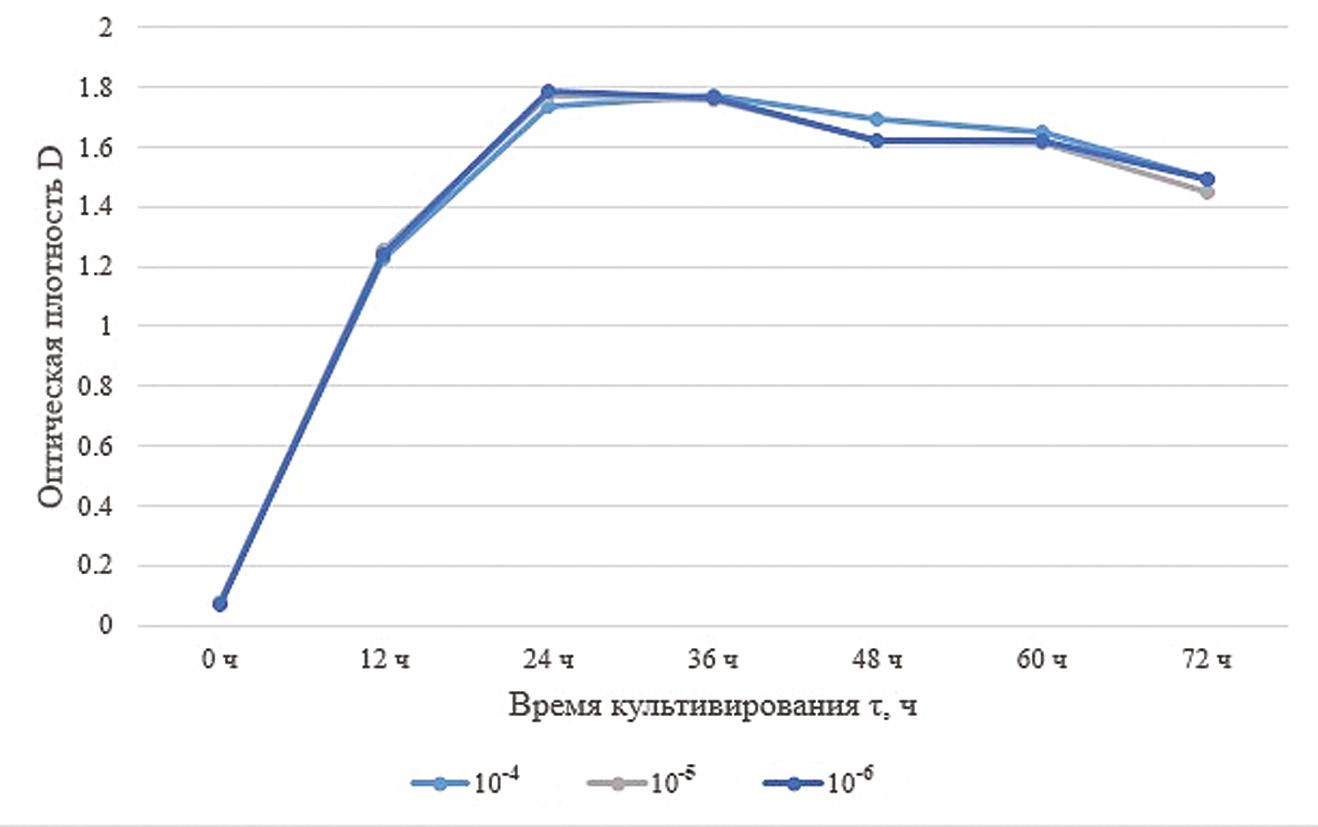 Пик оптической плотности приходится на 24 ч, после чего наступает стационарная фаза и спустя 60 ч фаза отмирания. Поэтому для культивирования штамма достаточно 72 ч. Оптимальным выбрано разведение посевного материала 10–2, что соответствует концентрации клеток 14·106 клеток/мл.