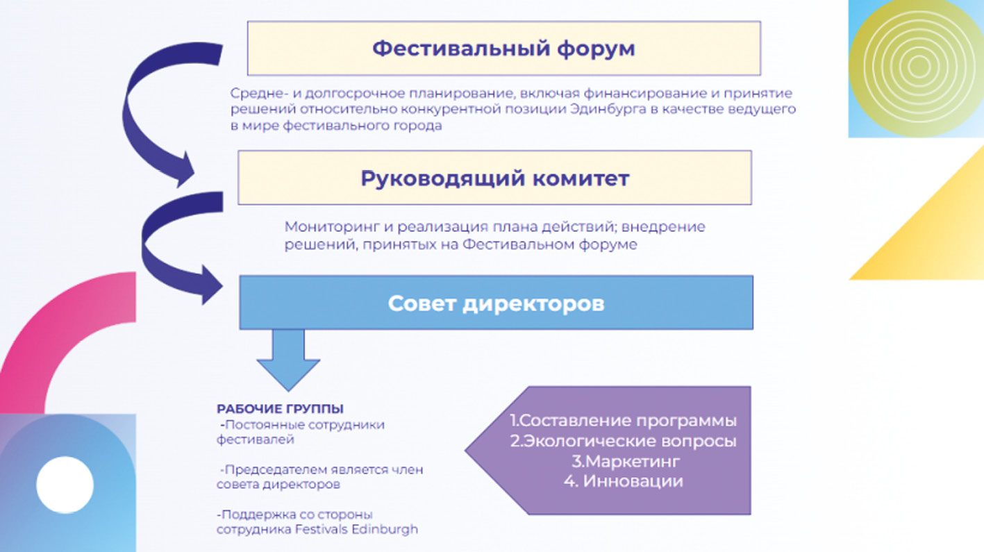 Фестивальный форум выполняет функции стратегического центра, отвечающего за средне- и долгосрочное планирование, определение приоритетов развития, распределение финансовых ресурсов и принятие ключевых решений, направленных на поддержание конкурентоспособности как ведущего фестивального города мира.